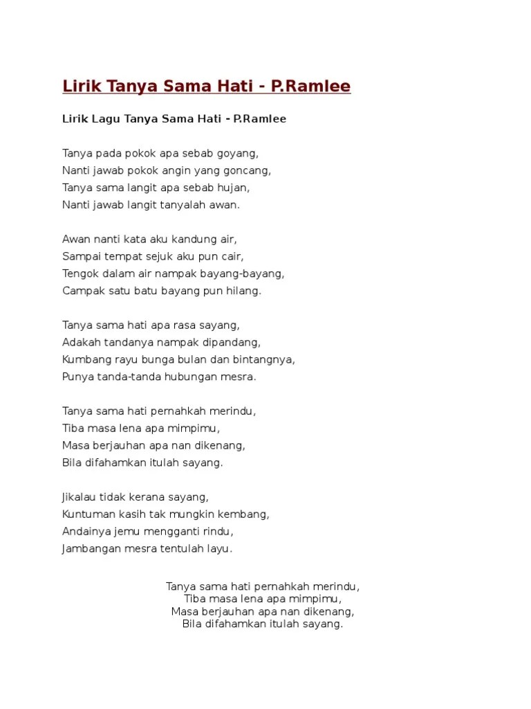 Tak tahu tak tahu ke mana. Obat sakit gigi · guitar hero 2015 song list · zodiak · list song dua lipa · list drama song wei long . Tanya sama pokok apa sebab goyangnanti jawab pokok angin yang goyangtanya sama angin apa sebab goyangnanti jawab angin tanyalah awanawan . P ramlee tanya sama pokok/69979. Tanya sama hati pernahkah merindu, tiba masa lena apa mimpimu, masa berjauhan apa nan dikenang, bila difahamkan itulah sayang. Tanya sama pokok, apa sebab goyang, nanti jawab pokok, angin nan goncang, tanya sama langit, apa sebab hujan, nanti jawab langit, tanyalah awan. Menyusur di kaki lima terlihat bayang wajah kelmarin | smule social singing karaoke app.